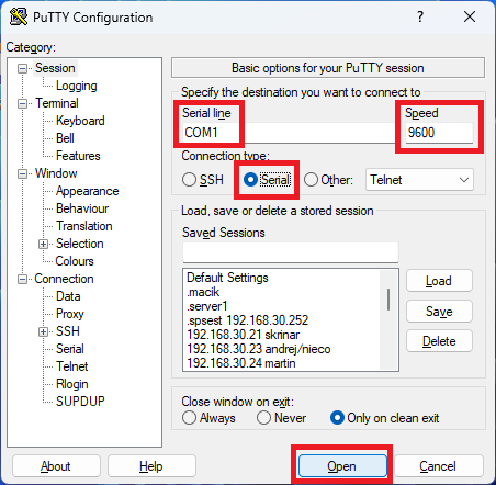 Pre pripojenie sa službou telnet spustite program putty znova a nastavte si ho podľa obrázka