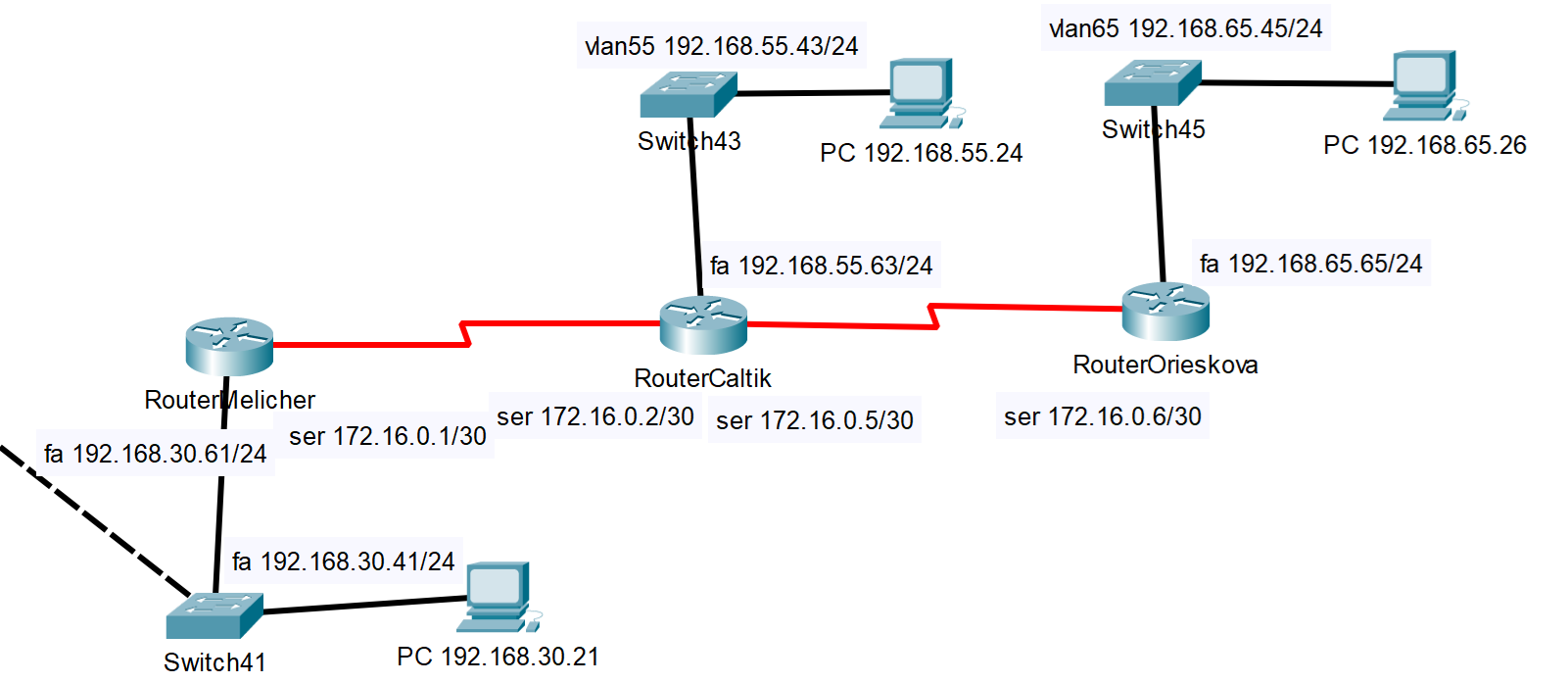 13. Nastavte statické smerovanie do všetkých sietí, ktoré sú vo vašom sieťovom segmente dostupné. Informácie ako na to môžete získať opäť v Cisco kurze Podstatné je určiť ktoré siete je potrebné pridať do smerovacej tabuľky. Aké je číslo siete (u sietí s netmaskou /30 to nebude na konci nula, ale treba to správne určiť). A tiež určiť cez akú adresu sa do tejto siete dá dostať (next hop).