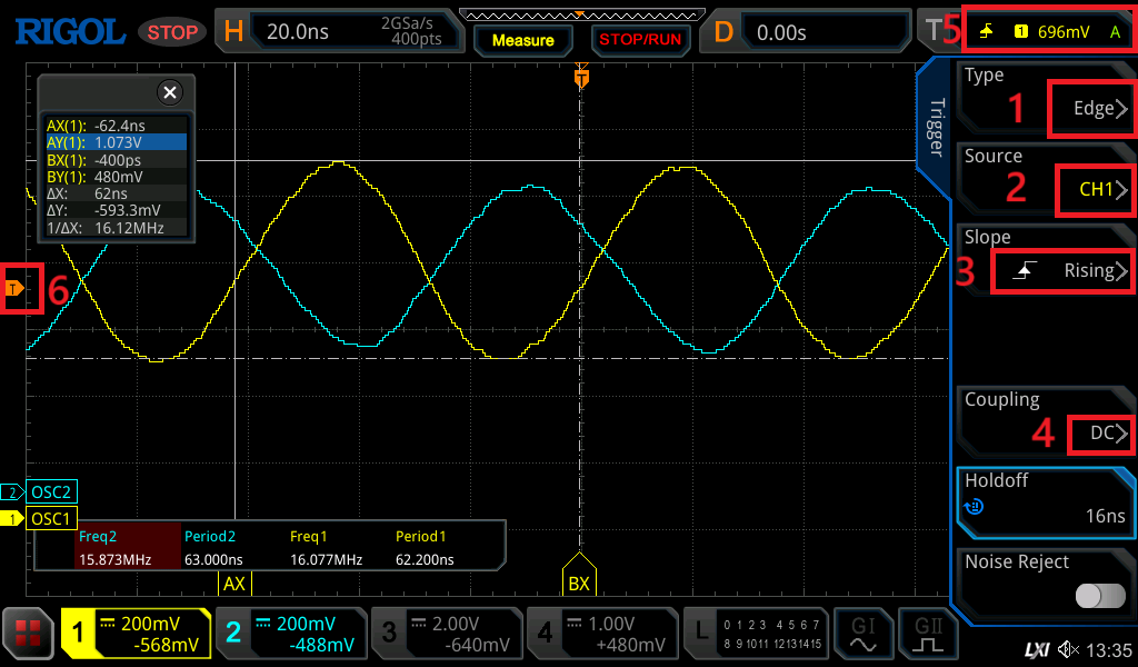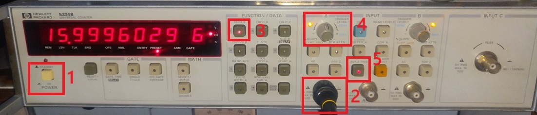 Zapnite čítač (č.1). Odpojte jednu sondu z osciloskopu a pripojte si ju na vstup A čítača. (č.2) Zvolte meranie frekvencie na vstupe A. (č.3) Zapnite funkciu Auto Trigger. (č.5) a nastavte úroveň spúšťania tak aby hodnota na displeji bola stabilná.