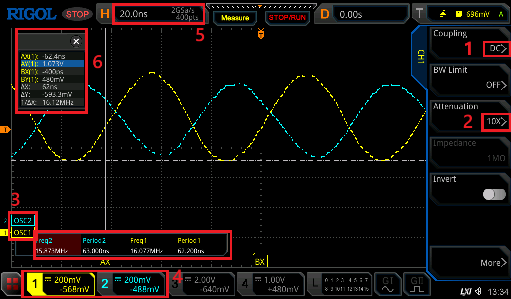1. Zapnite si osciloskop a pripojte na kanál 1 a 2 osciloskopické sondy.