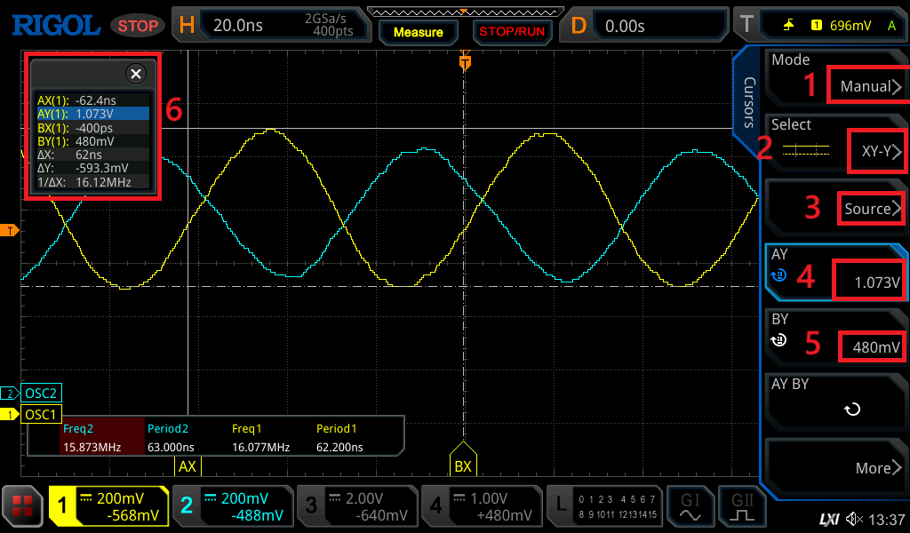 28. Počas celého nastavovania v okienku (č.6) vidíte údaje odčítané na mieste kurzorov, plus vypočítané nejaké zaujímavé hodnoty ako je rozdiel hodnôt oboch kurzorov. V časovej osi je aj prevrátená hodnota tohto rozdielu, ktorá udáva frekvenciu signálu.