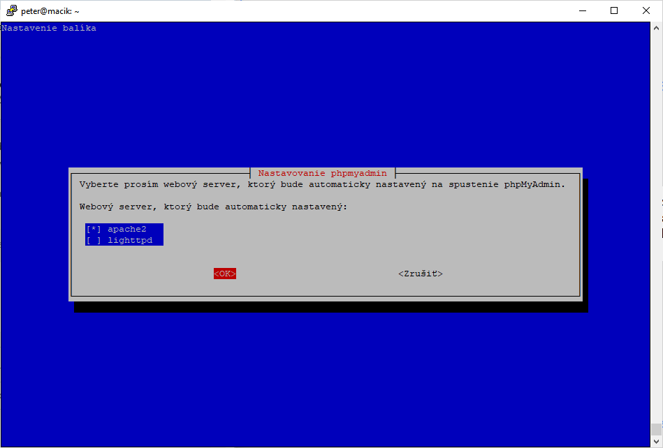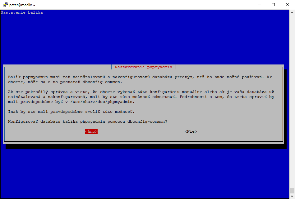 Nakoniec sa spustí konfigurátor inštalácie balíka phpmyadmin