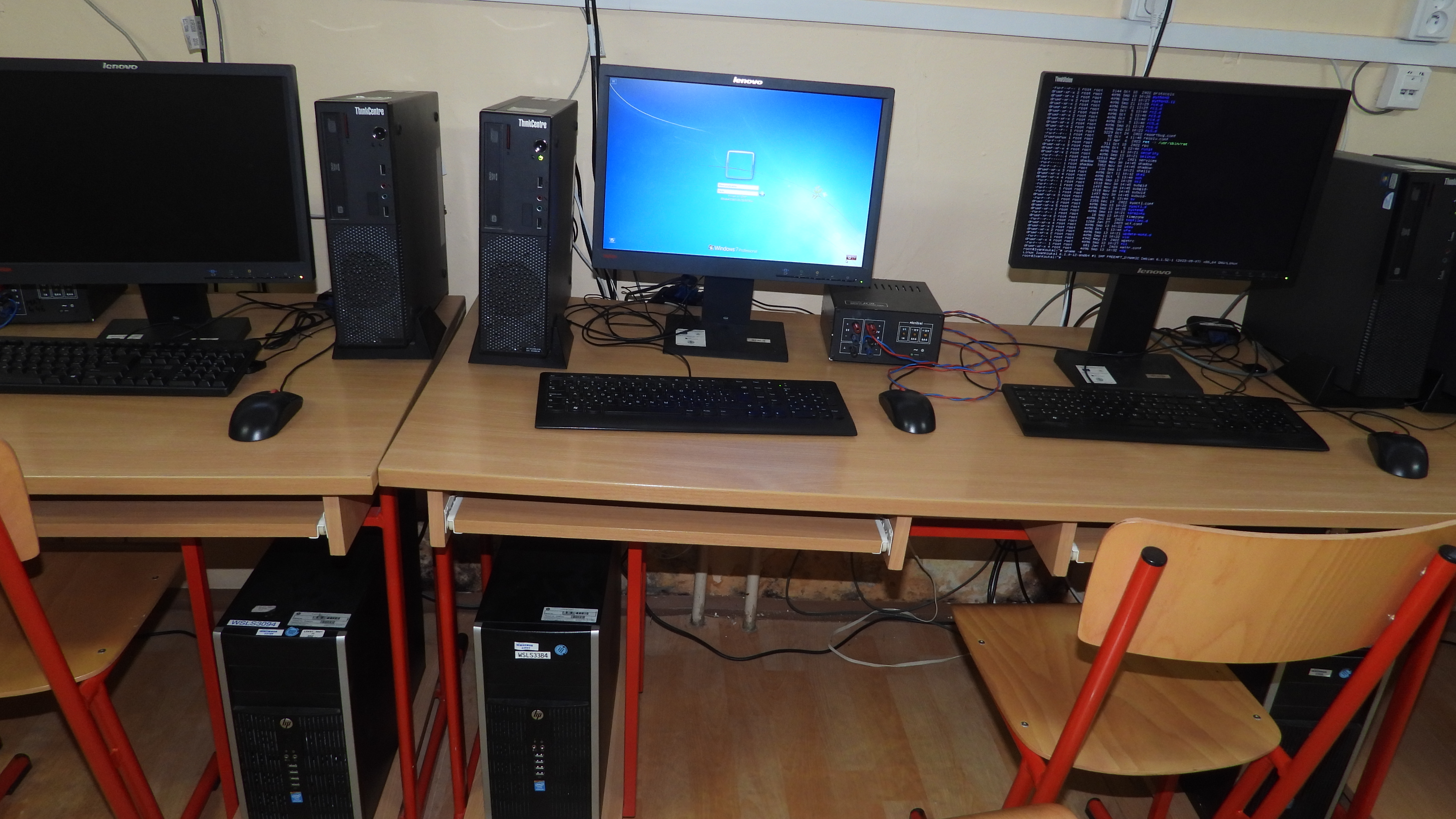 Toto je moje pracovisko v učebni 906. Skladá sa z dvoch počítačov. Prvý počítač sa na chádza na lavici a je to IBM thinCentre. Beží na ňom operačný systém Windows 7 a počítač má 4GB pamäte RAM. Dolu pod lavicou sa nachádza počítač HP. tento počítač slúži ako server. Klávesnica myš a monitor sa prepína medzi týmito dvomi počítačmi pomocou prepínača ATEN.